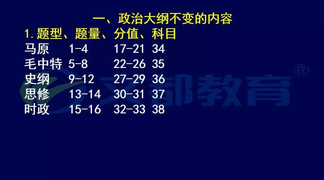 政治大綱不變的是題型、題量、分值和科目,每個科目的分布和對應的分值都是不變的。有些同學做題甚至不知道它考的是哪個科目,那你得把我這張表記一下。