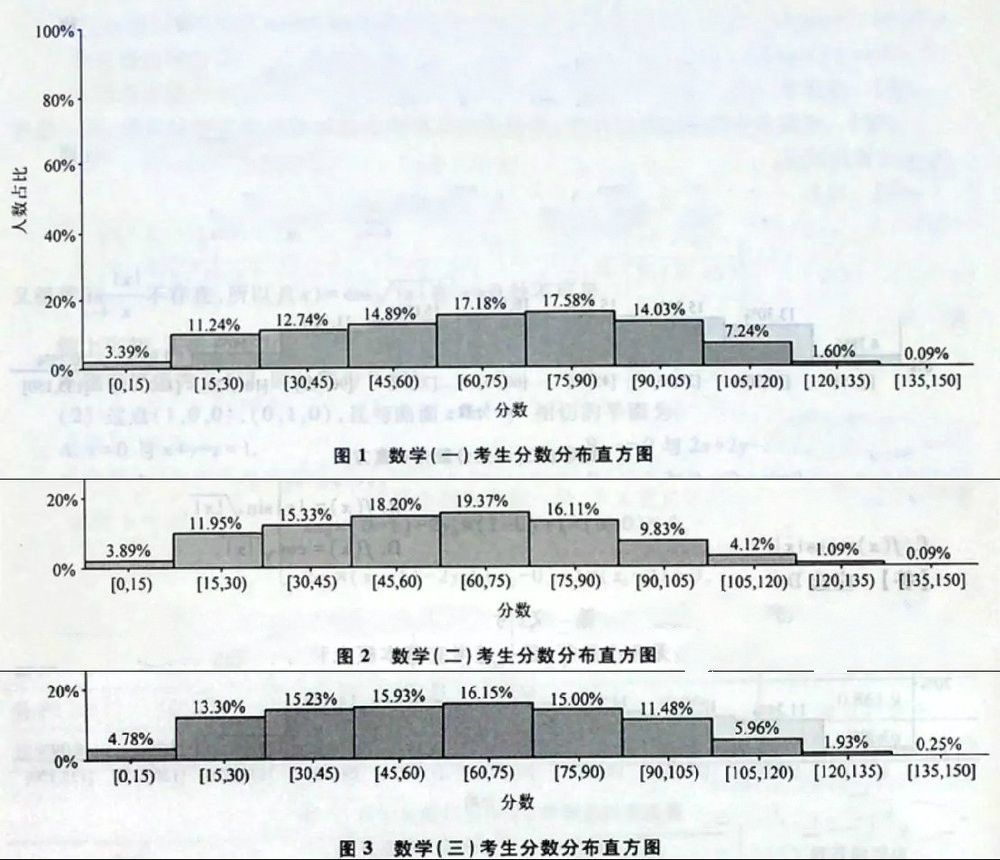 通過上圖大家可以看到,考研數學一、二、三的成績符合正態分布,并且成績較為分散!平均成績大概在60-75分,和之前統計的平均分是一致的;只有不到20%的人考試分數在90分以上。