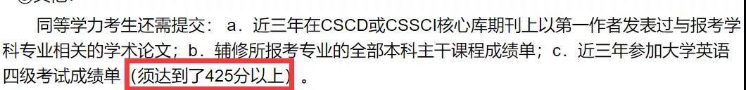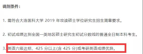 有少部分院校專業的調劑條件與四六級成績直接掛鉤,比如大連醫科大學腫瘤干細胞研究院袁予輝課題組在調劑要求中寫明:英語六級達標,425 分以上(含 425 分)或考研英語成績優異;西北農林科技大學在調劑要求中寫明:調劑學碩需四級達到425分。