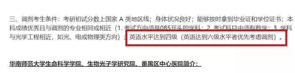 華南師范大學生命科學學院、生物光子學研究院2019年光學工程(專業碩士)調劑信息公告中有一條:英語水平達到四級(英語達到六級水平者優先考慮調劑)。