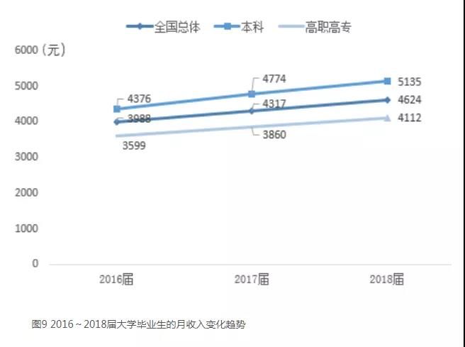 ▲麥可思《2019年就業藍皮書》中2016-2018屆大學畢業生月收入變化趨勢圖