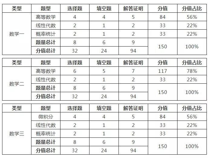 數一、數二、數三題型分布、占比具體如下: