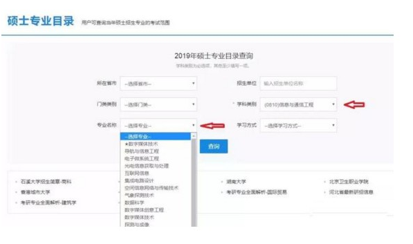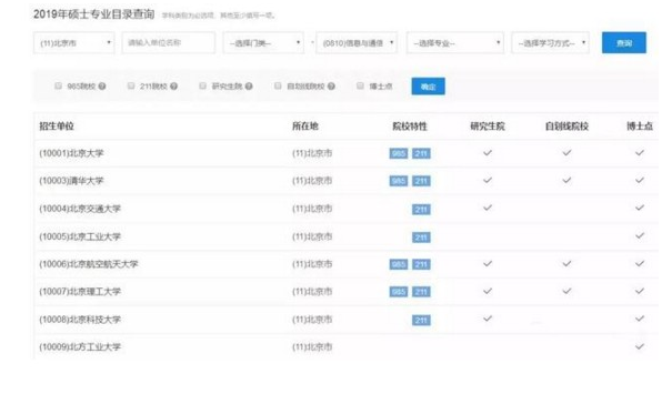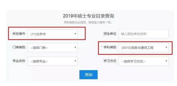 比如,小王同學打算去北京讀信息與通信工程,但并不確定要讀哪個具體專業,就像圖中這樣操作:省市選擇想去的地區,學科類別選擇要報考的一級學科,專業名稱和其他留空。