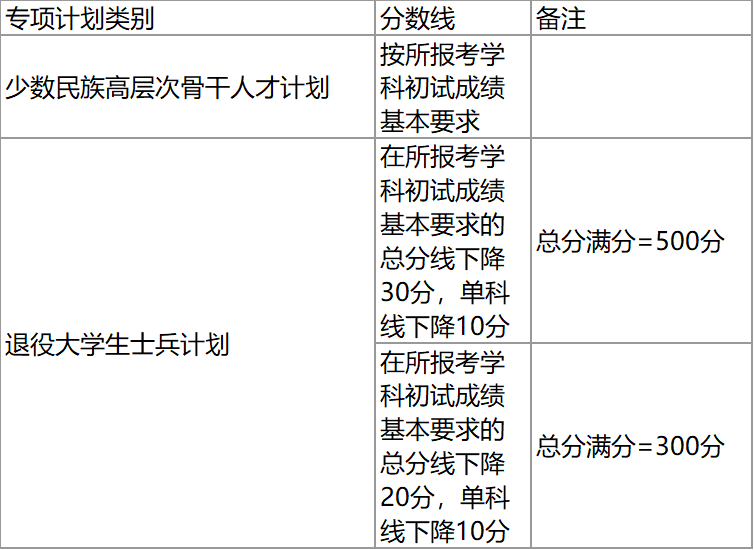 三、專項計劃考生的初試成績基本要求: