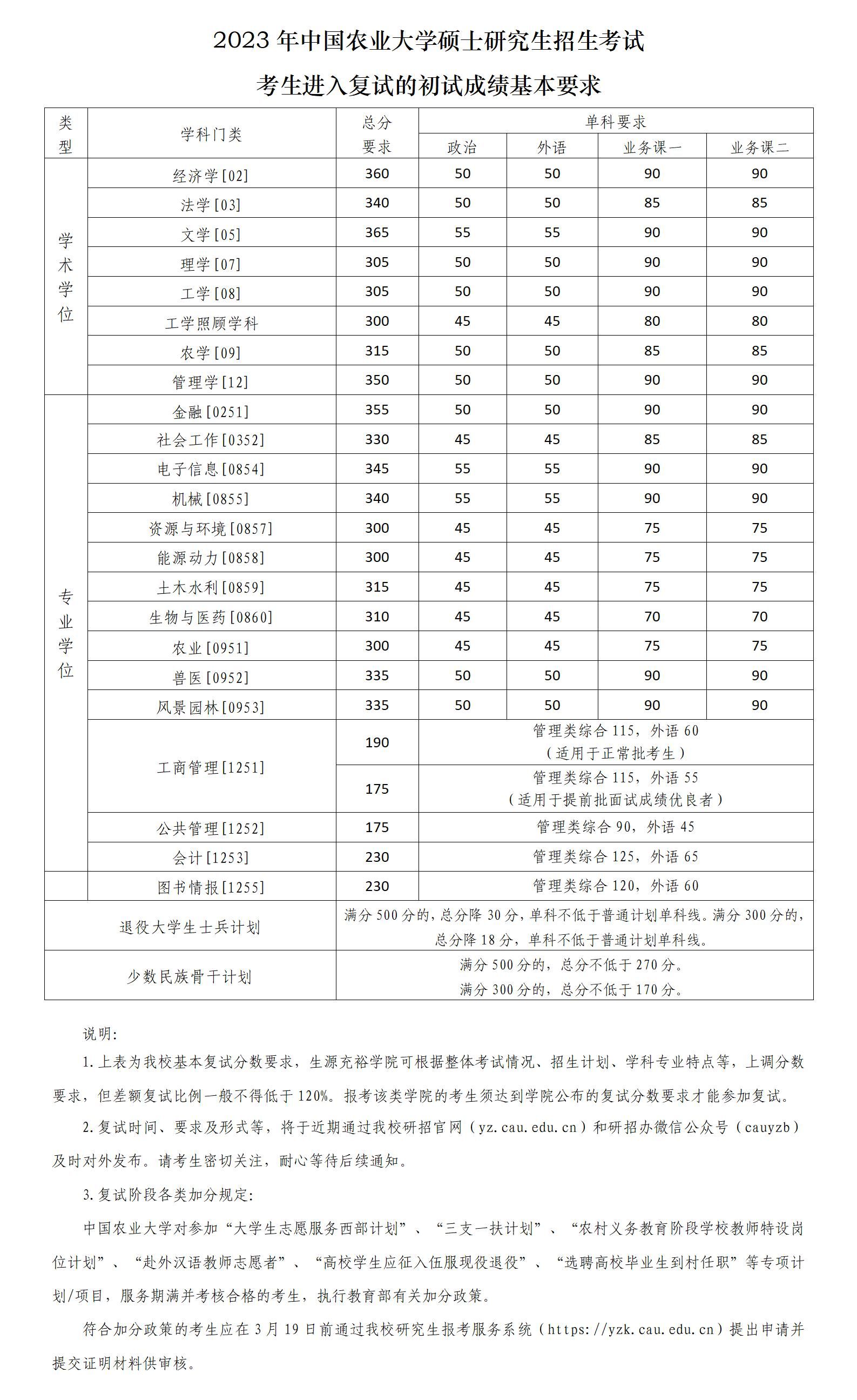 2023年中國農業大學碩士研究生招生考試考生進入復試的初試
