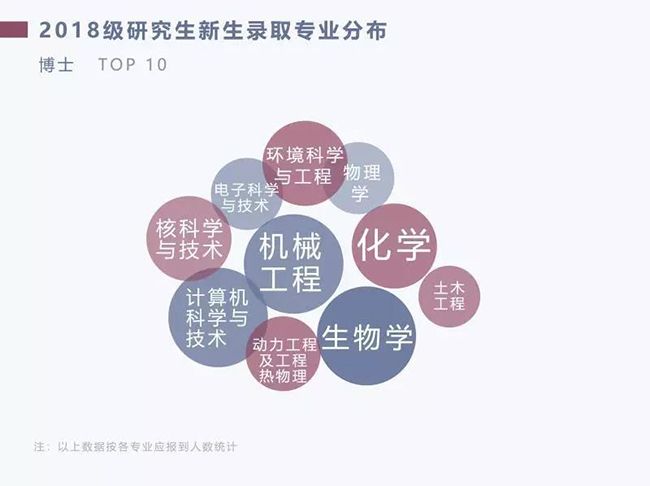 博士生新生錄取專業TOP10分別為生物學、機械工程、化學、計算機科學與技術、核科學與技術、環境科學與工程、物理學、動力工程及工程熱物理、土木工程和電子科學與技術。