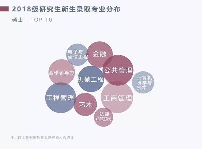 碩士生新生錄取專業TOP10分別為工商管理、公共管理、金融、工程管理、機械工程、全球領導力、藝術、電子與通信工程、法律(非法學)和計算機科學與技術。