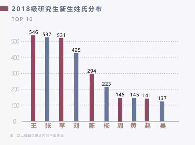 在新生同學中,我們見到“王同學”、“張同學”和“李同學”的概率最大。碩士生中“張同學”最多,為350人;博士生中“李同學”最多,為217人。
