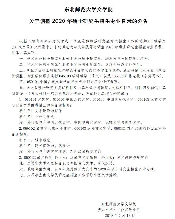?? 特別提醒:東北師范大學文學院學碩和專碩都不再招同等學力考生,相關同學報考需注意;另:專碩初復試科目不作任何調整,學碩復試科目不作調整,部分專業初試科目調整如下: