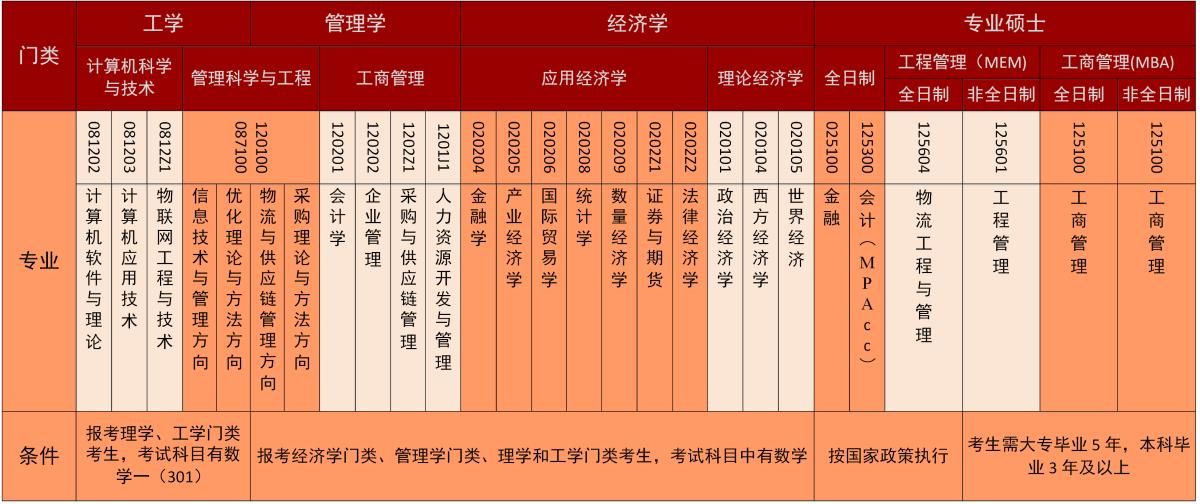 ??目前我校擁有應用經(jīng)濟學、理論經(jīng)濟學、管理科學與工程、工商管理、 計算機科學與技術(shù) 共5個一級學科碩士學位授權(quán),下設22個二級學科(研究方向)碩士學位授予權(quán)。 我校還擁有金融專碩、會計專碩(MPAcc)、工商管理碩士(MBA)、工程管理碩士(MEM) 4個專業(yè)學位碩士培養(yǎng)類別。其中工商管理碩士(MBA)包括全日制與非全日制,工程管理碩士(MEM)包括物流工程與管理領(lǐng)域(全日制)和工程管理領(lǐng)域(非全日制)。具體招生方向和領(lǐng)域如下圖所示: