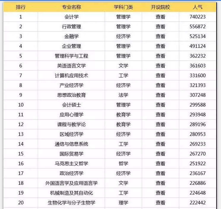 從表格中我們可以看出幾個熱門的學科有管理學、經濟學、法學、計算機科學與技術、軟件工程學、新聞學等。