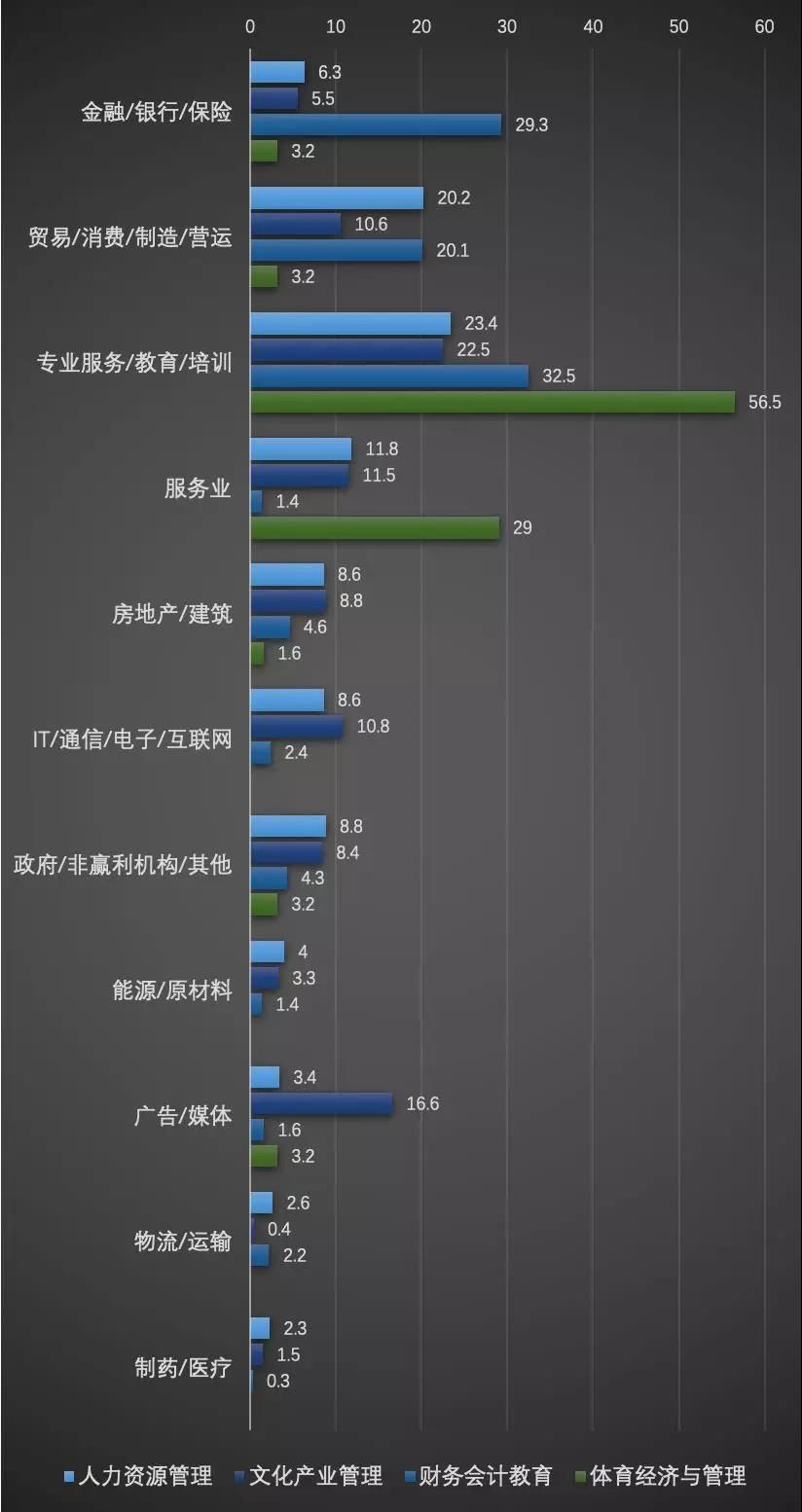 人力資源管理、文化產業管理、財務會計教育、體育經濟與管理專業的同學最多選擇的是專業服務/教育/培訓行業,分別為23.5%、22.5%、32.5%、56.5%。其中,體育經濟與管理在這一選擇上最為集中。