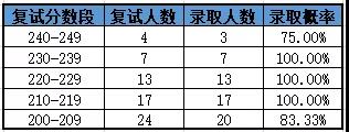 一志愿全日制復試分數線235分,參加復試12人,錄取7人,復試錄取比為1.71;復試最高分254,最低分236;全日制錄取初試最高分254分,最低分236分;