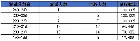 全日制一志愿參加復(fù)試78人,錄取49人,復(fù)錄比1.59;復(fù)試最高分242,最低分190分。