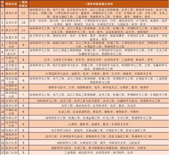 第三次的評估中擁有國家一級重點學科數最多的是清華大學,共有22個,其次是北京大學18個,排名第三的是浙江大學,14個,排名第四是的復旦大學,共計11個。這4所大學都擁有超過10個以上的一級重點學科,它們代表著我國最強的學科實力。