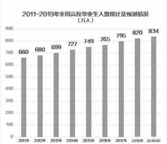 首先,畢業生人數的增多。從2011年到2019年,我國高校畢業生人數由660萬人增加到834萬人,增加了166萬。2018年大學應屆畢業生人數820萬,預估2019年大學生畢業人數在834萬,比2018年增長了14萬。就業人數的增加,與就業崗位需求量之間的矛盾,會導致就業越來越難。2019年285萬考生選擇考研,就從一個側面反應了就業難度之大,就業競爭激烈程度之高。