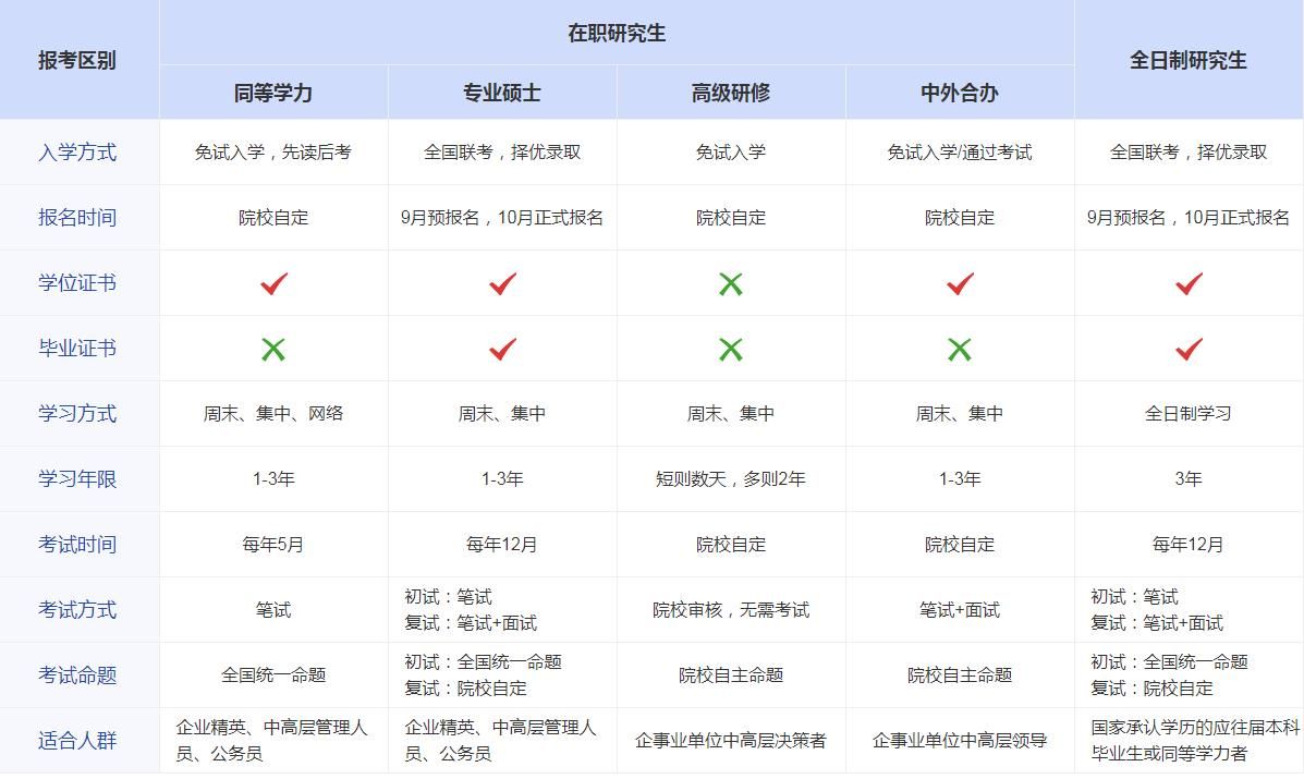 綜上所述,我們可以從下面三方面看出在職研究生和研究生的區別。在證書認可度在職研究生是比不上全日制研究生。由于全日制研究生一般都是周內學習,而在職研究生一般集中周末或節假日,學習的時長確實比全日制少,但是在職研究生接觸的是工作幾年的職場人,人脈比比全日制研究生廣。