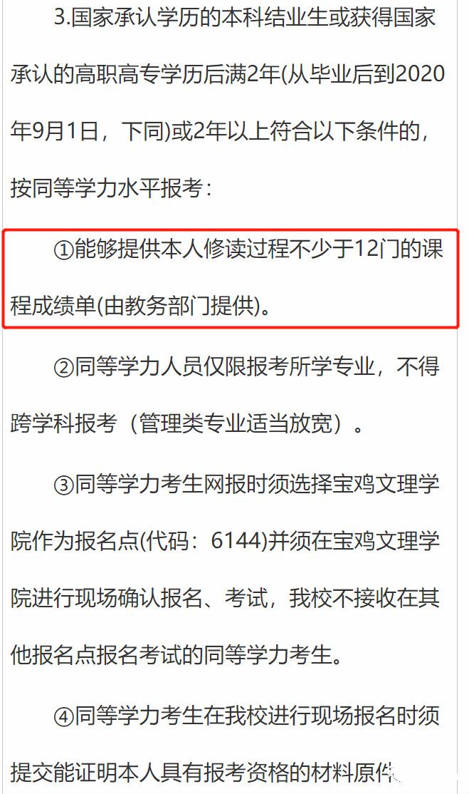 寶雞文理學院接受同等學力考生報考,但是在教育部要求之上提出了很多額外要求,其中要求進修12門本科課程的要求,等于拒接了大專學歷的考生。