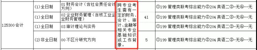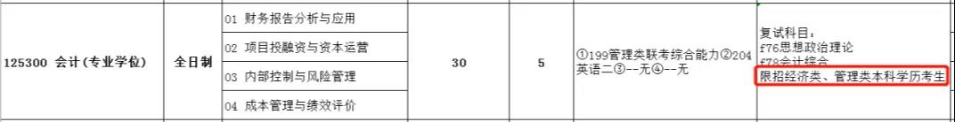 跨考限制:限本科畢業及以上學歷。復試時需參加專業課筆試:會計專業知識。限招收經濟學類(畢業專業代碼以02開頭)或工商管理類(畢業專業代碼以1202開頭)相關專業畢業考生。非全日制的,原則上招收在職定向就業人員。