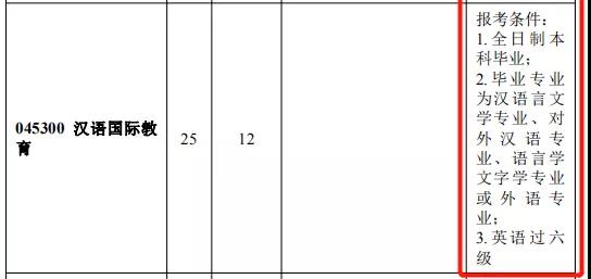 漢語(yǔ)國(guó)際教育報(bào)考條件:1. 全 日 制 本 科畢業(yè);2. 畢 業(yè) 專 業(yè) 為漢語(yǔ)言文 學(xué)專業(yè)、對(duì) 外 漢 語(yǔ) 專 業(yè)、語(yǔ)言學(xué) 文字學(xué)專業(yè) 或 外 語(yǔ) 專 業(yè);3. 英 語(yǔ) 過(guò) 六 級(jí)