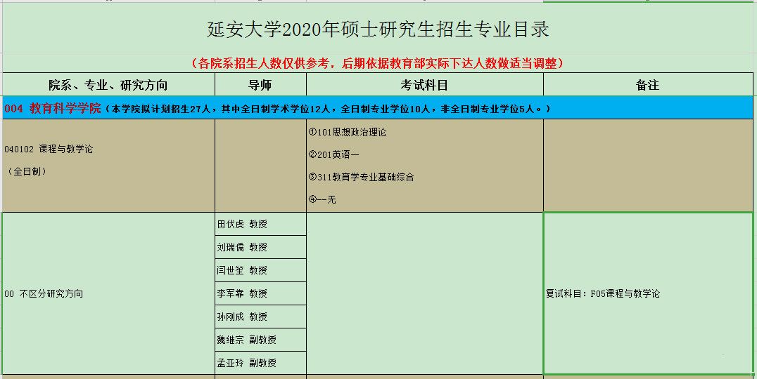 延安大學20年教育學僅招收課程與教學論1個專業的教育學研究生。