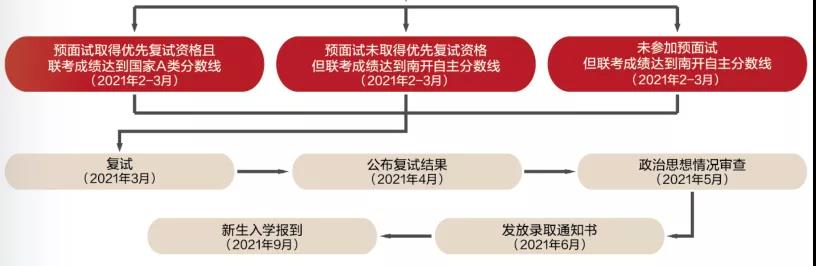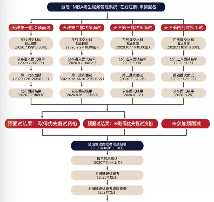 在預面試中未取得優先復試資格和沒有參加預面試的考生,聯考成績達到南開大學自主制定的復試分數線,可獲得復試資格。根據考生全國聯考成績和復試成績計算錄取成績(全國聯考成績的權重占50%,復試成績的權重占50%),從高到低排名,擇優錄取,按照招生名額錄滿為止。2021年預面試工作現已正式啟動,登錄“MBA考生服務管理系統”即可在線注冊,申請報名。