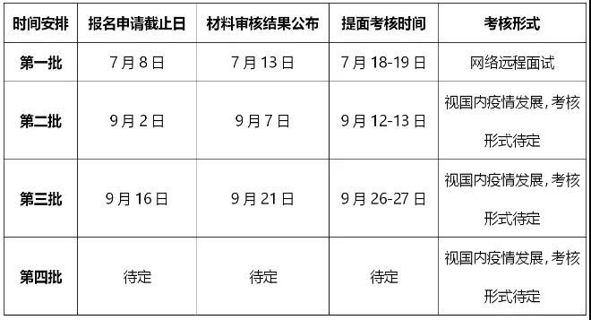 第一批次考生面試方式采用網(wǎng)絡(luò)遠(yuǎn)程面試形式,后面批次將視國內(nèi)疫情,考核形式待定。
