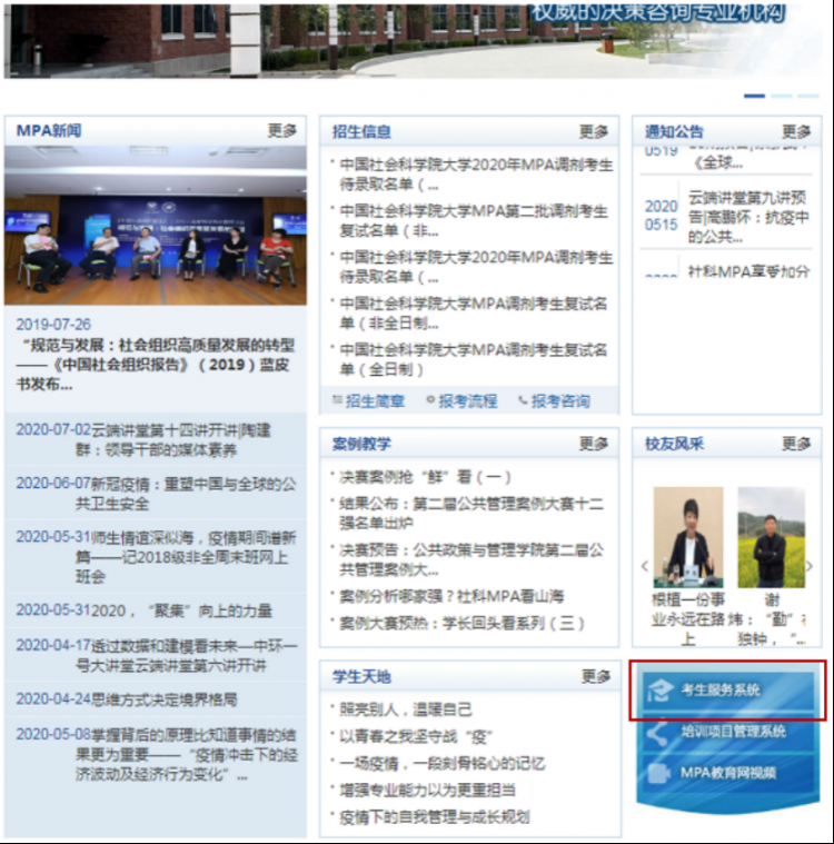 1.考生請登陸社科MPA教育中心網(wǎng)站(網(wǎng)址:www.cassmpa.cn)首頁右下角的考生服務系統(tǒng)(具體位置請見圖)