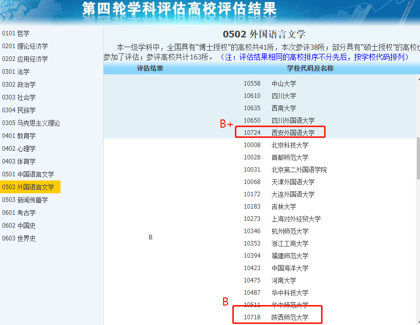 西外外國語言文學(xué)專業(yè)評估為B+,陜師大則為B