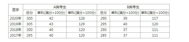 2017-2019年醫學考研國家線總分對比均較上年上漲5分;