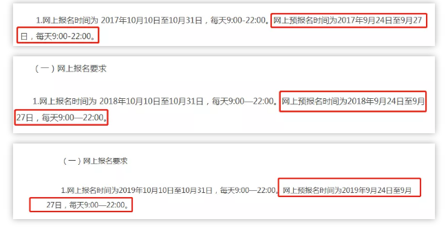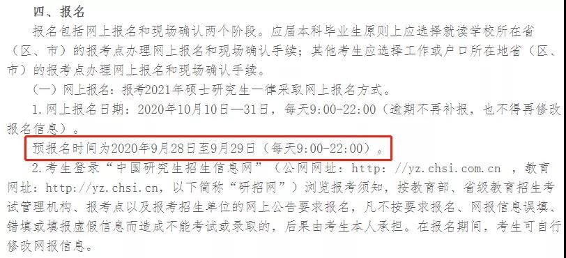 在此之前,2018-2020年的全國碩士研究生招生工作管理規定中提到的預報名時間均為考研當年的9月24日-9月27日(每天9:00-22:00)。