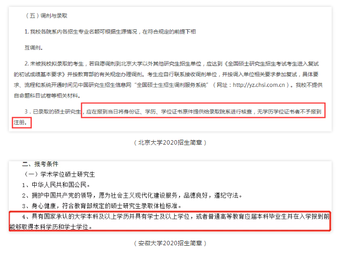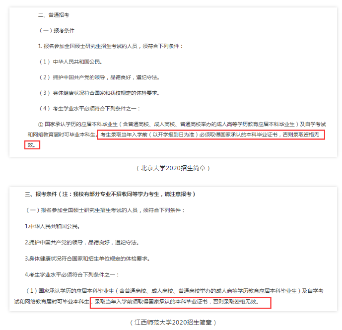 在各高校研究生招生簡章——報考條件那里,基本都會寫著要求應屆考生:錄取當年入學前必須取得國家承認的本科畢業證書,否則錄取資格無效。
