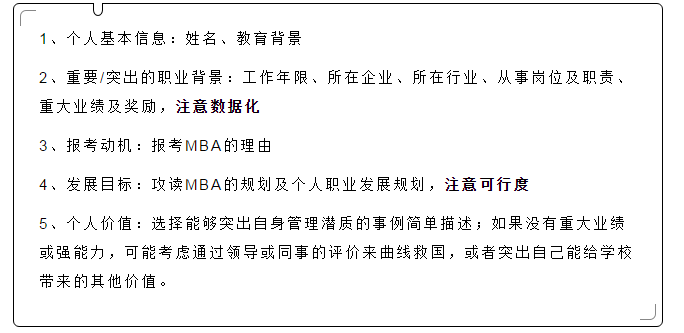 這里有個(gè)不得不注意的技巧是,在考生的自我介紹中,必須要清醒的認(rèn)識(shí)到:在自我介紹中不僅要表示自己需要來(lái)名校深造的愿景,還需要顯示出自己的價(jià)值,表示自己也值得院校選擇。很多同學(xué)的介紹里都急切地表明無(wú)論從哪個(gè)方面講都到了急需充電,急需到最高學(xué)府深造,往往都忽略了后半部分內(nèi)容。
