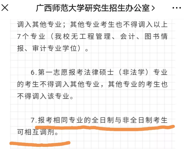 當然目前多數(shù)院校還是可以全日制調(diào)劑非全的,而且不排除一些特殊情況,比如廣西師范大學最近發(fā)布調(diào)劑方案: