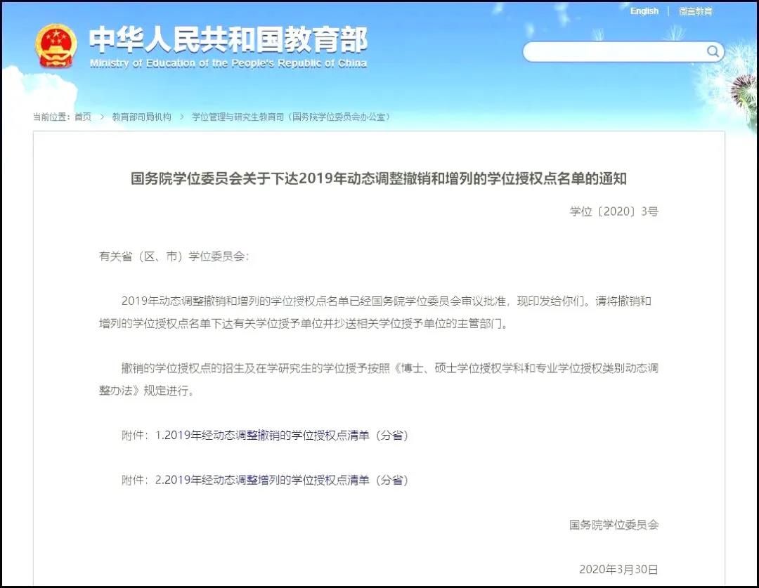 4月2日,教育部官網下達《國務院學位委員會關于下達2019年動態調整撤銷和增列的學位授權點名單的通知》,其中涉及到多所大學(單位)的學位授權點調整。