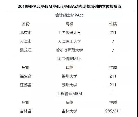 其中,各大高校或單位共撤銷193個學位點,新增231個學位點。針對會計、圖書情報、工程管理三個專業碩士的新增學位授權點如下: