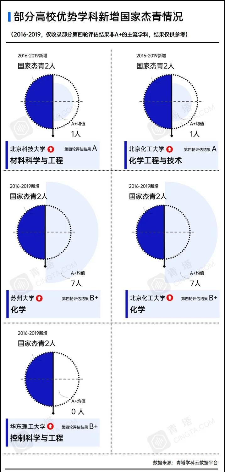 北京化工大學的化學工程與技術,華東理工大學的控制科學與工程,北京科技大學的材料科學與工程均新增杰青2人,表現明顯優于各學科中A+學科的均值。