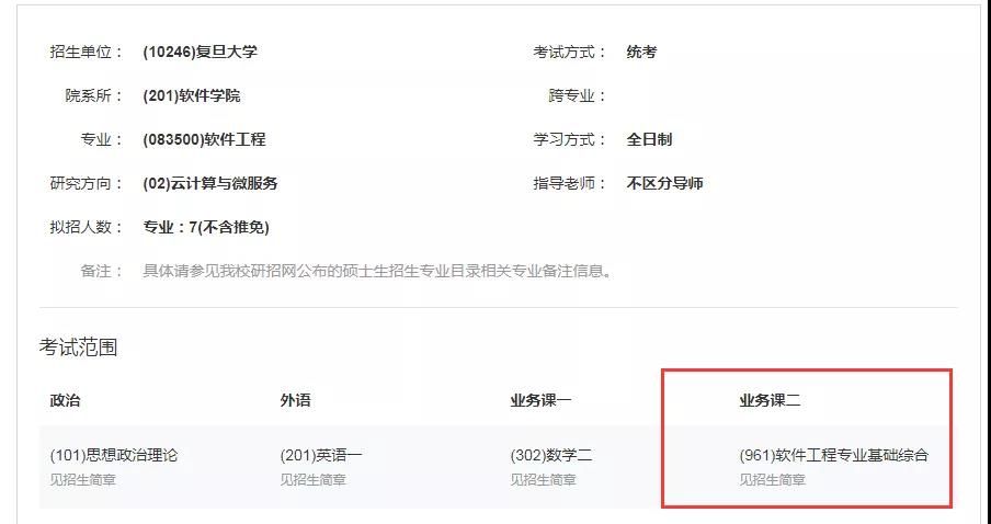 從公告中顯示的情況來看,軟件學院的軟件工程學碩妥妥的就是停止招生了,就算是其研究方向調整到計算機科學與技術學院相關專業招生,本質上專業代碼就已經發生了更改,這已經不能算作僅僅是換了一個學院進行招生的情況。這里專業代碼的更換,大多數時候都會涉及到專業課的更改。盡管今年最新的招生專業目錄還沒有出來,官網顯示會在9月份才發布,但是參考20年的專業目錄,這兩個學院的相關專業初試專業課考試科目確實有所差別。軟件學院之前開設的軟件工程學碩專業,專業課考試科目為961軟件工程專業基礎綜合,且公共課中的數學是考數學二。