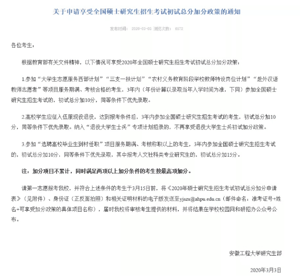加分政策:參加“三支一扶計劃”項目服務(wù)期滿、考核合格的考生,3年內(nèi)參加全國碩士研究生招生考試的,初試總分加10分,同等條件下優(yōu)先錄取。