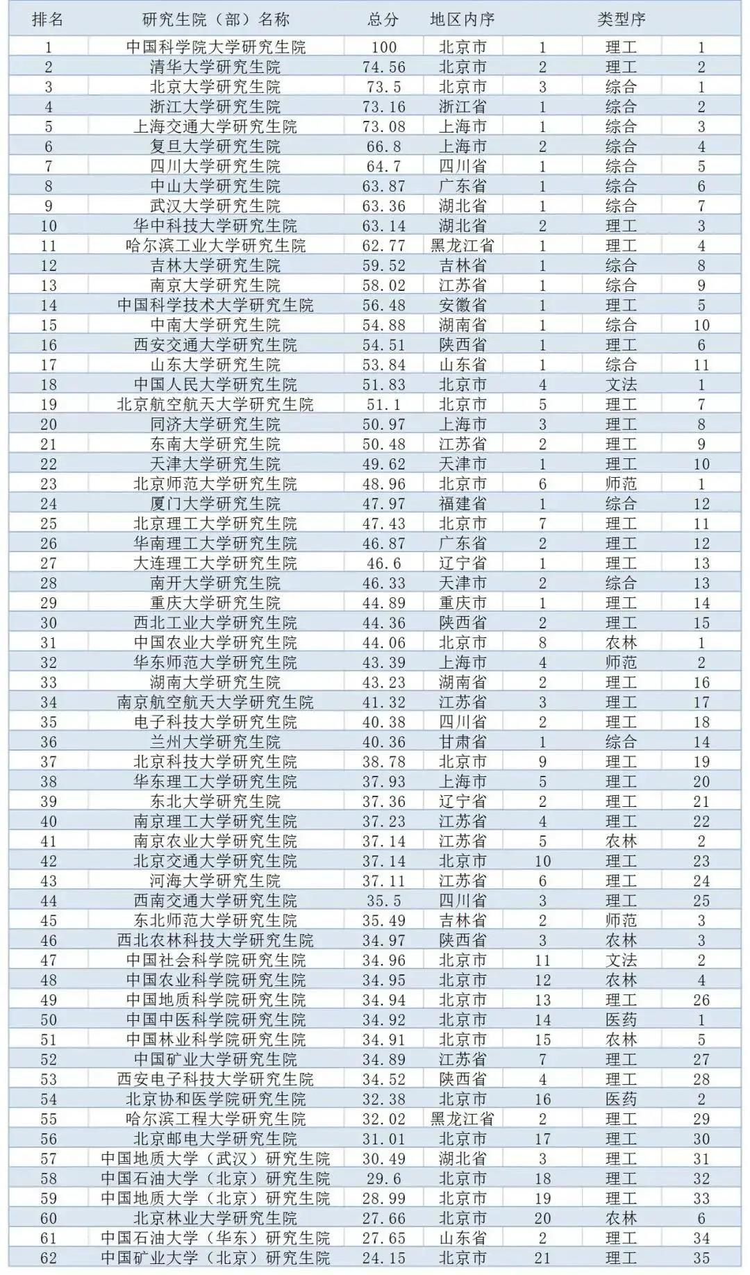 本次評價將兩地辦學的中國礦業大學、中國地質大學和中國石油大學分別按校區所在地劃分,真正反映教育資源的地區分布。并且此次的榜單上的排名僅有62個,并且僅僅是內地的研究生院排名,并不包括部分軍事類院校和港澳臺地區高校。