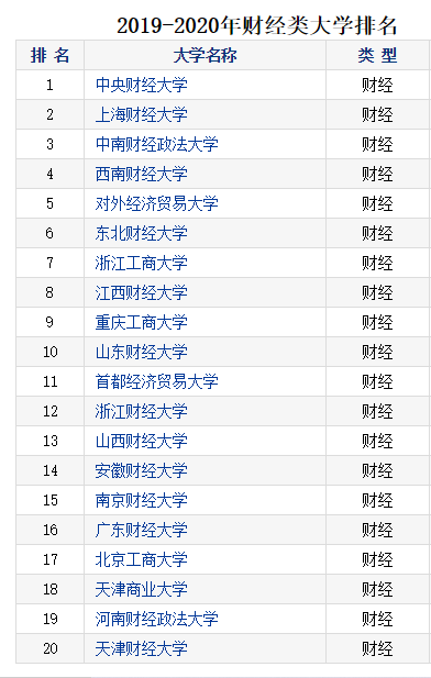 本次排名與2019-2020年的財經類大學排名相比,排名榜單產生了一些變化,中央財經大學與上海財經大學位列第一,第二名不變,對外經濟貿易大學從第五名上升至第三名,中南財經政法大學排第四名,西南財經大學排第五名。