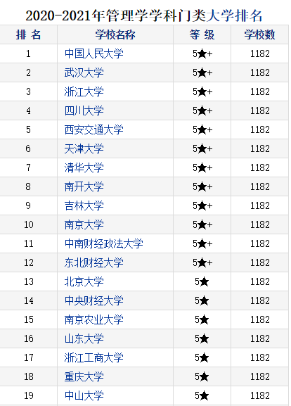 從2020-2021年管理學科門類大學排名表看出,中國人民大學排名第一,武漢大學,浙江大學緊隨其后。